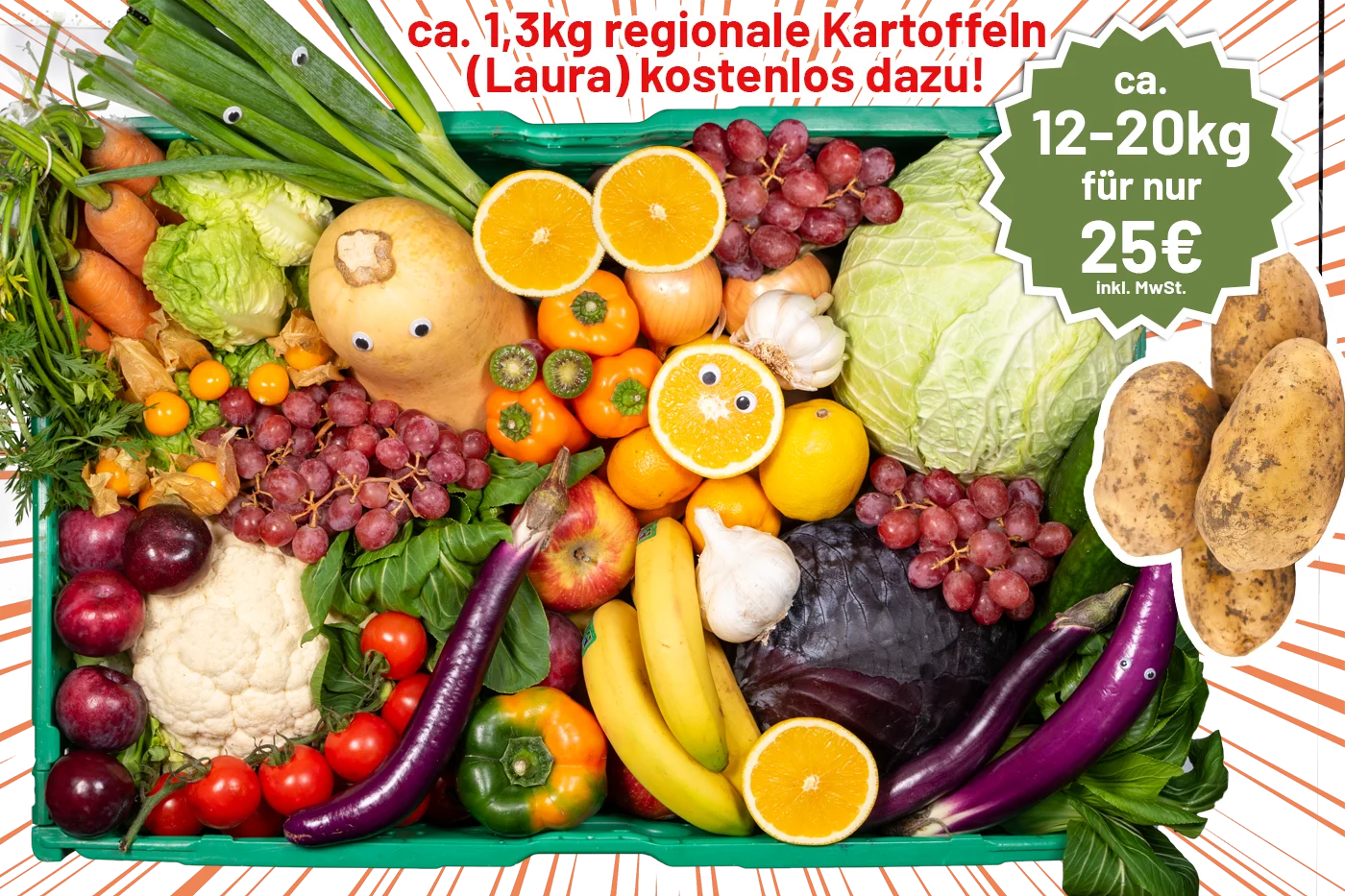 Das Obst & Gemüse, welches aufgrund von Überproduktion weggeworfen werden müsste, wird durch deinen Kauf gerettet.