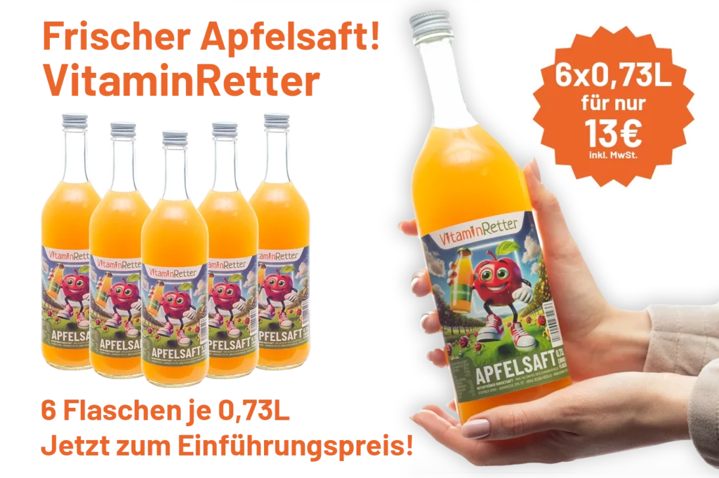 Gemeinsam mit einem regionalen Partner aus Sachsen-Anhalt konnten wir unseren eigenen VitaminRetter Apfelsaft herstellen. Die zahlreichen geretteten Äpfel wurden in 0,73-Liter-Flaschen zu einem superleckeren, milden, naturtrüben Direktsaft verarbeitet 🍎🥤 Ganz ohne künstliche Zusätze oder Verdünnung. 100% purer Direktsaft. Heute an jedem Standort als Ticket und eine Flasche zu jeder geretteten VitaminerBox. 🧃