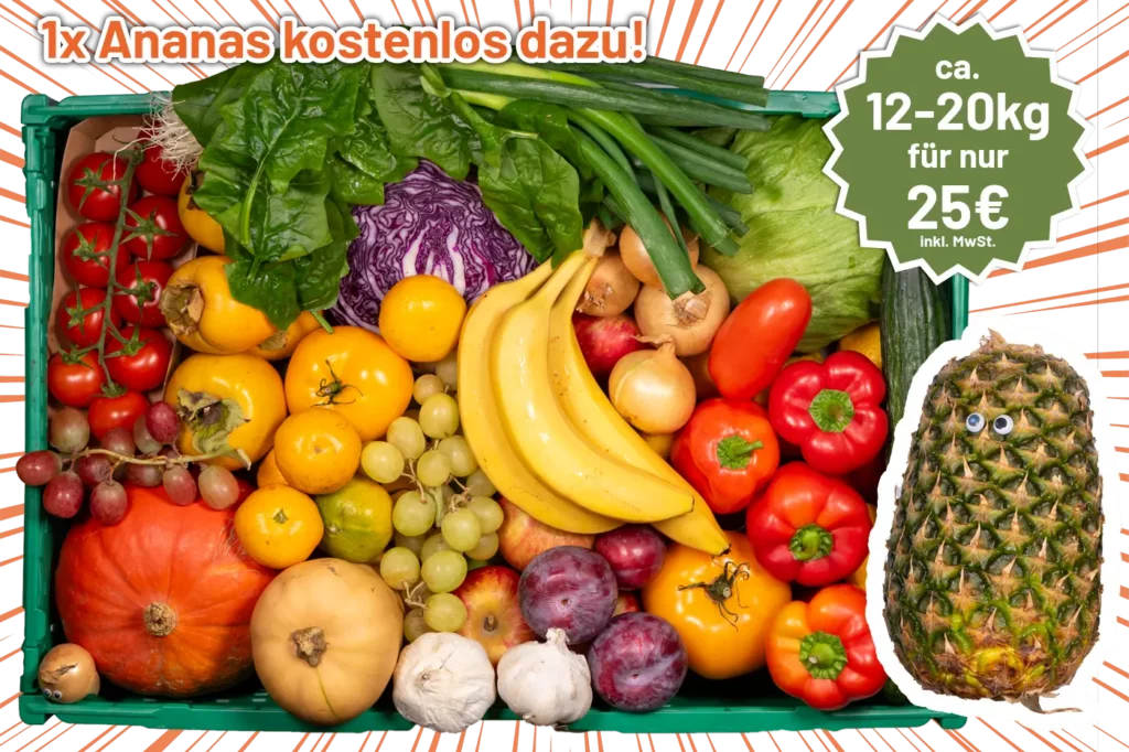 Da wir Lebensmittel vor der Verschwendung retten und die Verfügbarkeit dieser stark variiert, kann sich die Zusammensetzung der Boxen unterscheiden. Deshalb kann es vorkommen, dass der tatsächliche Inhalt Deiner RetterBox von den Inhalten in der Liste abweicht. Wir bemühen uns jedoch stets, Euch eine ausgewogene und wertvolle Auswahl zu bieten.