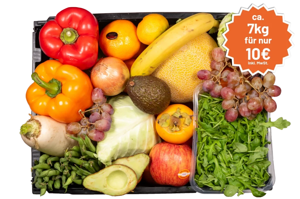 Da wir Lebensmittel vor der Verschwendung retten und die Verfügbarkeit dieser stark variiert, kann sich die Zusammensetzung der Boxen unterscheiden. Deshalb kann es vorkommen, dass der tatsächliche Inhalt Deiner RetterBox von den Inhalten in der Liste abweicht. Wir bemühen uns jedoch stets, Euch eine ausgewogene und wertvolle Auswahl zu bieten.