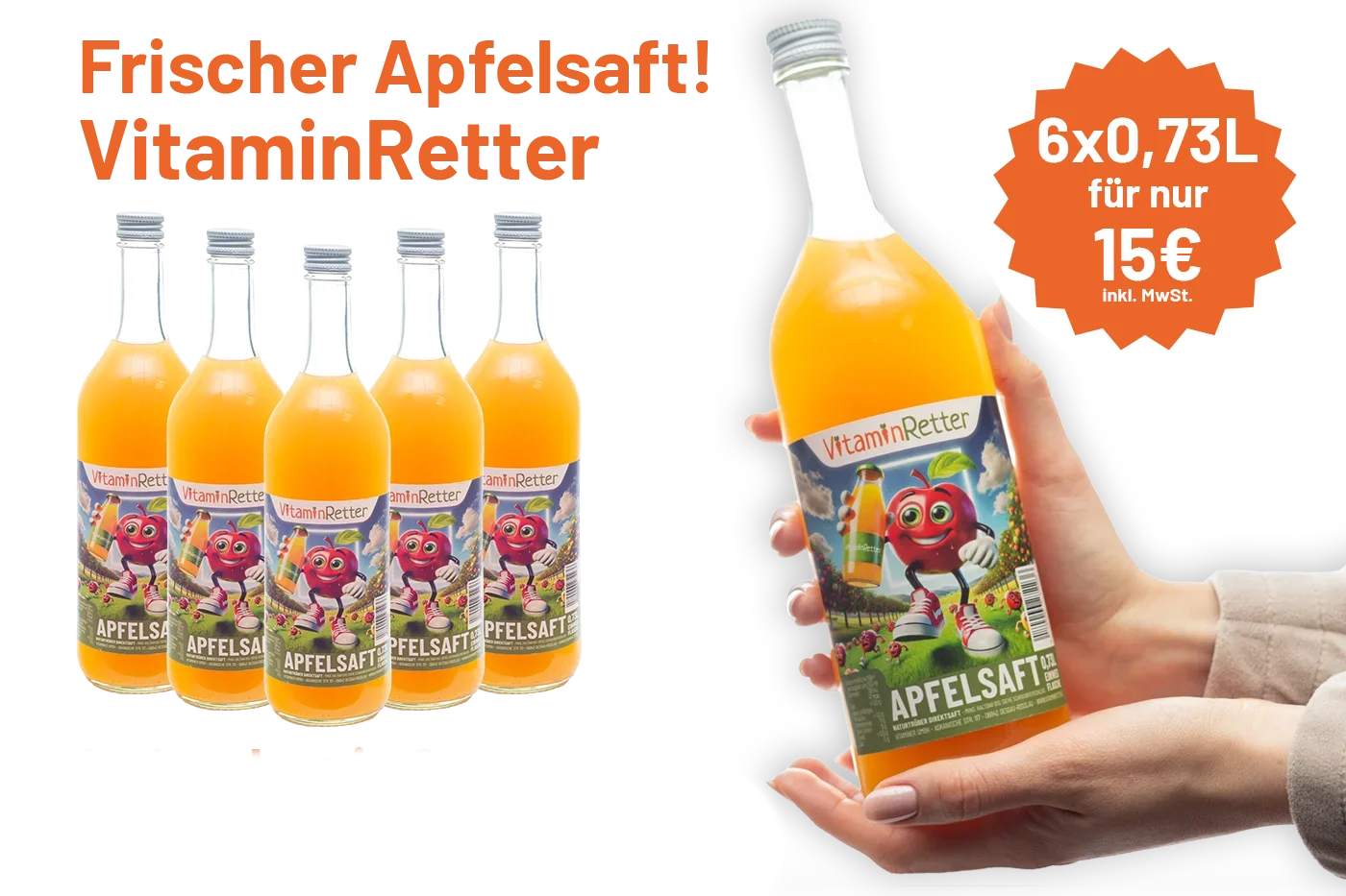 Gemeinsam mit einem regionalen Partner aus Sachsen-Anhalt konnten wir unseren eigenen VitaminRetter Apfelsaft herstellen. Die zahlreichen geretteten Äpfel wurden in 0,73-Liter-Flaschen zu einem superleckeren, milden, naturtrüben Direktsaft verarbeitet 🍎🥤 Ganz ohne künstliche Zusätze oder Verdünnung. 100% purer Direktsaft. Heute an jedem Standort als Ticket und eine Flasche zu jeder geretteten VitaminerBox. 🧃
