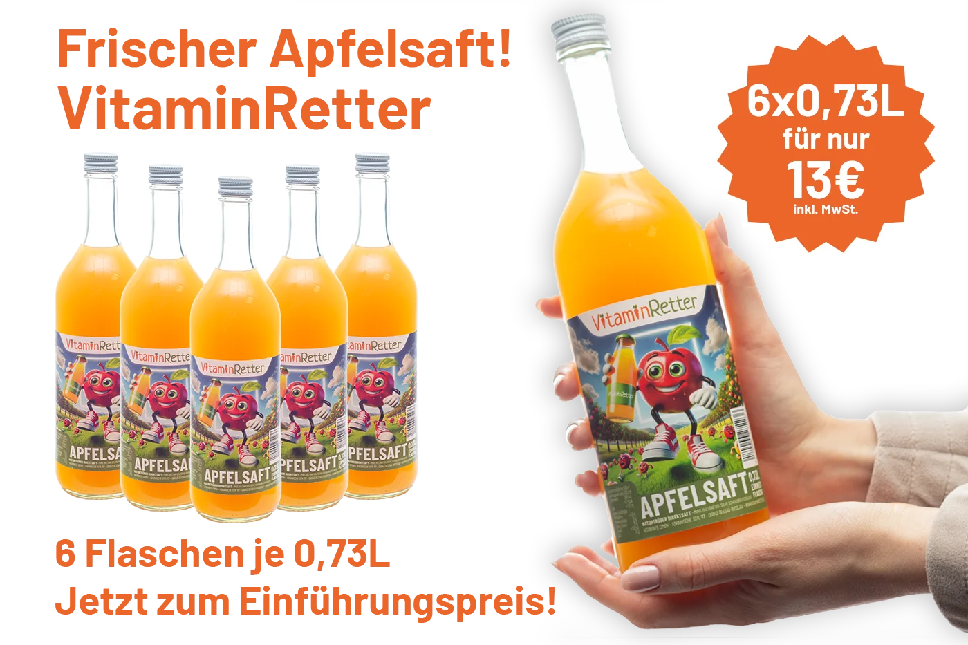Gemeinsam mit einem regionalen Partner aus Sachsen-Anhalt konnten wir unseren eigenen VitaminRetter Apfelsaft herstellen. Die zahlreichen geretteten Äpfel wurden in 0,73-Liter-Flaschen zu einem superleckeren, milden, naturtrüben Direktsaft verarbeitet 🍎🥤 Ganz ohne künstliche Zusätze oder Verdünnung. 100% purer Direktsaft. Heute an jedem Standort als Ticket und eine Flasche zu jeder geretteten VitaminerBox. 🧃