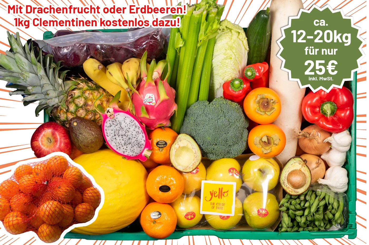 Mischung von EU- und Nicht-EU-Obst und -Gemüse. Die Artikel sind ausschließlich zur Verarbeitung bestimmt und entsprechen nicht mehr den angegebenen Güteklassen. Die Ware ist vor der Weiterverarbeitung vom Käufer selbst zu kontrollieren.